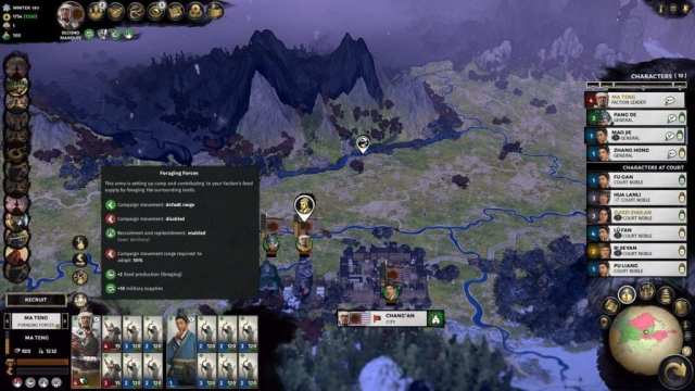You’ll also be able to recruit a new general/retinue or a separate army in the next turn, but try to check your court first. There might be a strategist-type general (blue/water) that can be recruited. They have perks to increase your revenue from commerce, silk, or spices — and you’ll have loads of these since Ma Teng’s situated right next to the Silk Road.
