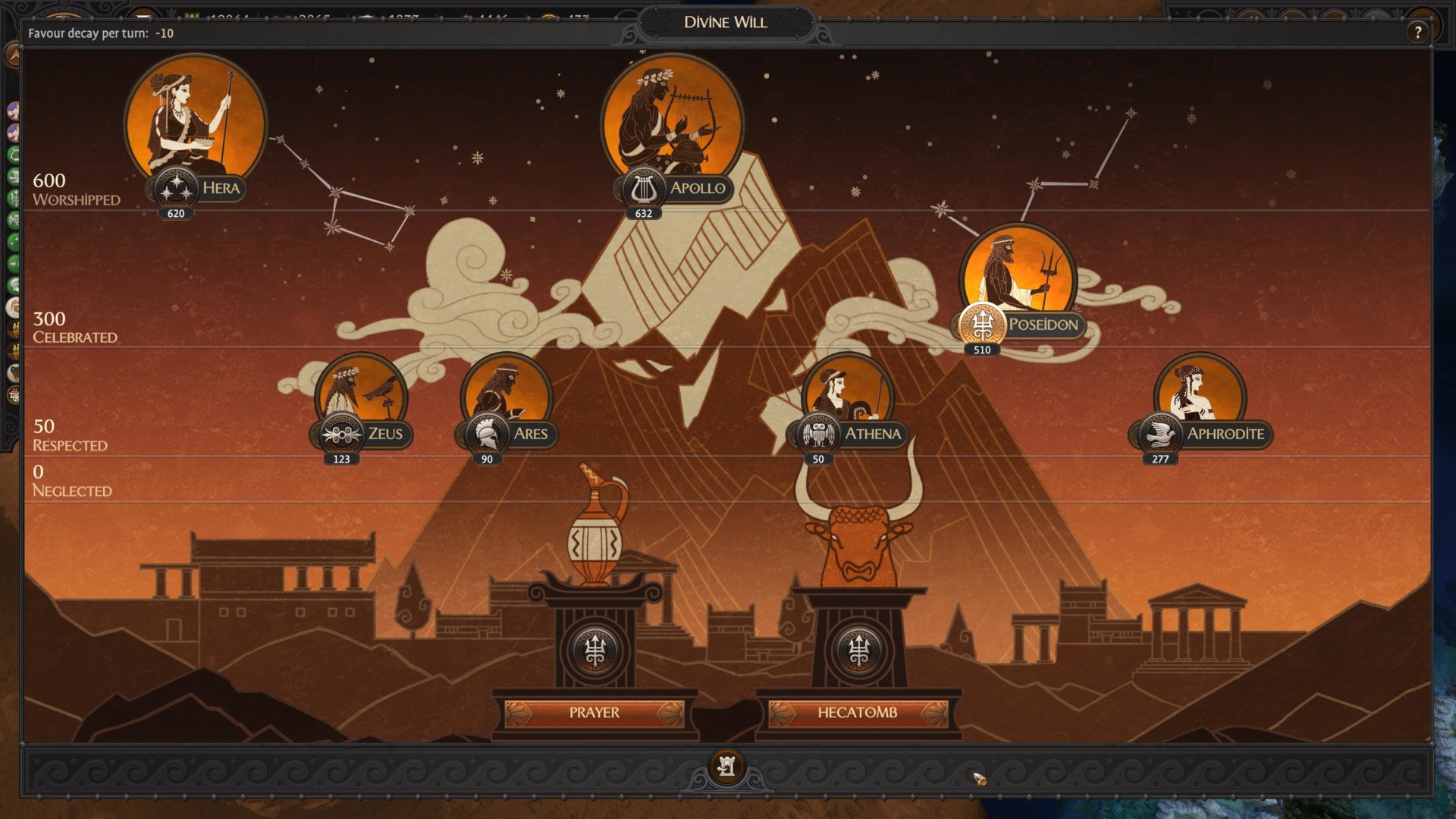 As for the Greek pantheon, they don’t necessarily take on the form of humans. Instead, they’re part of the Divine Will mechanic that lets you initiate hecatombs or offer prayers. While I would’ve preferred an apparition of Apollo firing a deadly arrow or a spirit of Athena shielding her chosen, the Divine Will mechanic itself remains an important dynamic in your playthroughs due to providing new strategic layers and synergy.