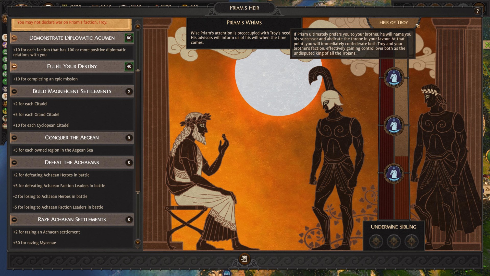 Still, I do have other misgivings while completing A Total War Saga: Troy‘s campaigns. First, there’s the “Antagonist” mechanic, a challenge where a faction you’ve fought against becomes an “endgame” rival (going so far as to initiate a “scorched earth” policy whenever you capture its settlements). On paper, that sounds like a decent feature similar to Shogun 2‘s Realm Divide, Rome 2‘s Civil War, or Three Kingdoms‘, uh, Three Kingdoms formation. Regrettably, it can prolong your playthrough if your antagonist happens to be a main/playable faction from the other side.