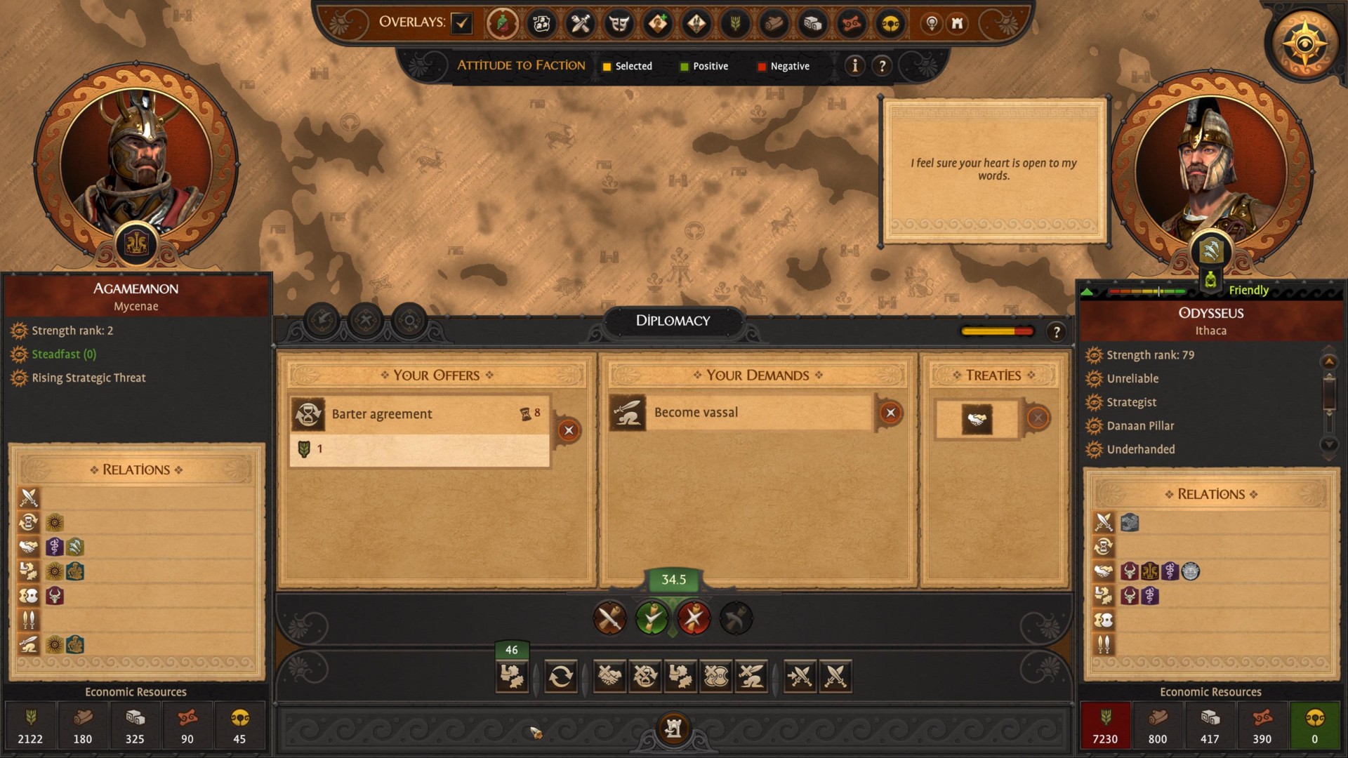 As for bartering, A Total War Saga: Troy relies on a system that lets you trade resources even for several turns and with extra diplomatic treaties involved such as non-aggression pacts, alliances, or territories. It’s akin to what you’ve seen in Total War: Three Kingdoms. Unfortunately, I also encountered a particular issue with bartering. It seems that you could end up cheesing or exploiting resource gains so easily — such as a single bushel of food netting you 50+ diplomatic favor — that it makes the challenge moot. Worse, the AI sometimes does this too and it’s possible to see minor factions with thousands of food within the span of a few turns.