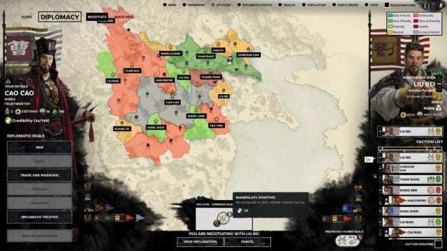 What makes Cao Cao’s playstyle unique, however, is his resource: Credibility. Every turn, you accrue a small amount of this resource. When you have 25 credibility, you can use it to boost your diplomatic relations with another faction. Alternatively, you can also manipulate them to feel more negatively about their neighbors, nudging them closer to war.