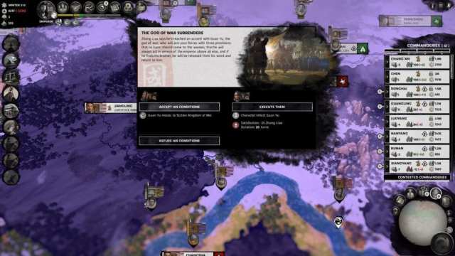 Much later, when you have Zhang Liao in your army and you’re facing off against Liu Bei, the God of War, Guan Yu, might get convinced to join your faction. Again, I was able to get this event to fire once. After reloading a save, I could not get it to happen again.