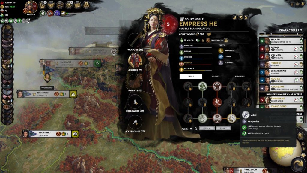 - Liu Hong, Empress He, and the eunuchs having a special quirk where they can’t be deployed on the field and they can only be used for assignments or court positions. Still, they retained the default officer skill trees which include “battle-only” perks such as increased unit speed, retinue attack/defense boosts, vanguard deployment, and actual combat abilities (seen below).