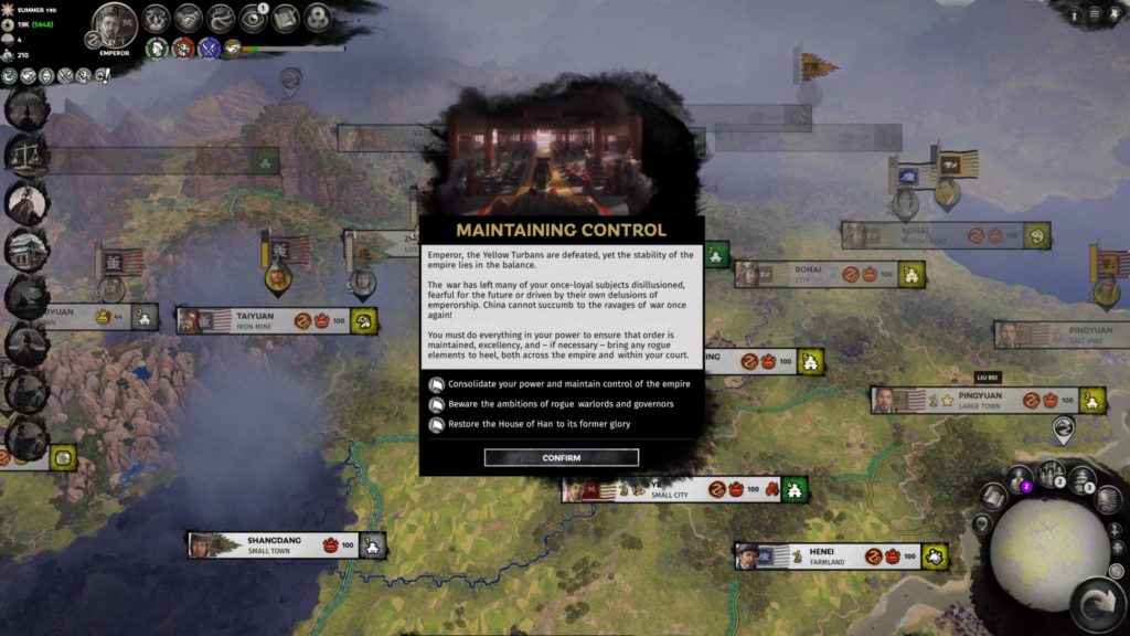 I can also take note of how ridiculously easy it can be to finish off the Yellow Turbans even at higher difficulties. It’s possible to complete Mandate of Heaven‘s campaign in 30 or so turns by just slapping Zhang Jue and his brothers in the north. You won’t even need to bother with the revolts in other parts of the map. Oh, and, here’s the kicker: the ending cinematic is still the same as Total War: Three Kingdoms‘ grand campaign.