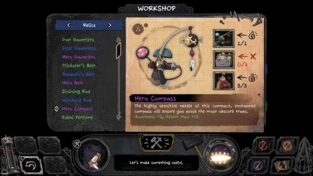 Relics are also quite an important feature in Vambrace: Cold Soul. There are a handful of them, conferring boons to your characters’ stats (including health and vigor), and some even change their flourish or special attack. Lower-tier relics might boost a stat while lowering one, but epic (purple) versions, obtained later in the game, provide bonuses only with no downsides. Try to craft relics that can boost the aforementioned important stats — combat and awareness for most party members, and overwatch for at least one.