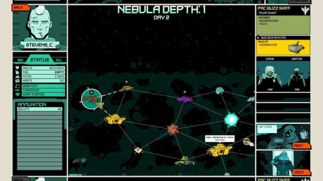 This isn’t too much of a problem most of the time, as both food and fuel can readily be found on wrecks. And being stocked up on both can give you a ton of leeway to skip over wrecks that don’t have anything you need. Many wrecks have parts that you need to build story progression items and equipment. Clicking on a wreck before traveling to it will inform you of what important part it contains if there is one, what that part will build, what’s on the ship, and what kind of enemies you’ll face there.