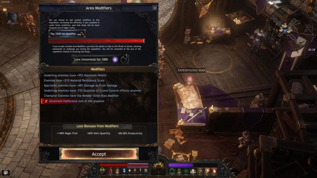 Second, you’ve got mandates and expeditions. To complete Stormfall projects, you’ll need to spend a bit of gold, primordial affinity, and production. Production is only earned by doing these activities — very short missions with modifiers that you can select; tougher runs will mean better rewards. Think of these as akin to Path of Exile‘s Atlas maps or Diablo III‘s rifts and adventures.