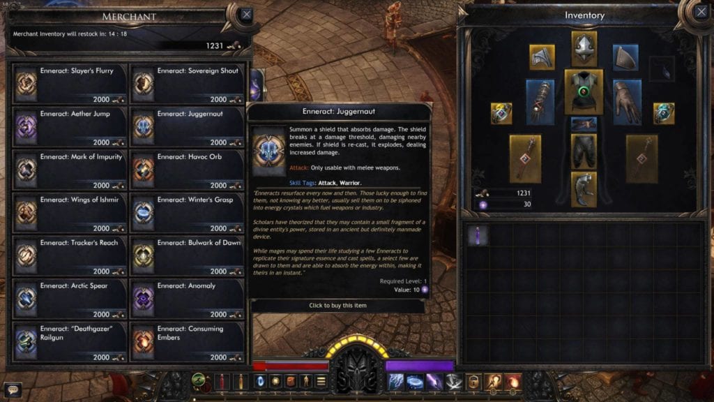 Enneract skills, just like other looted items, can drop from enemies or be purchased from a vendor. All the Enneract skills you have level-up if you have them equipped or if you spend primordial affinity (a currency much like gold). In turn, you can select modifiers for your skills making them more potent for each fight. The effects of these upgrades also become visible via a panel.