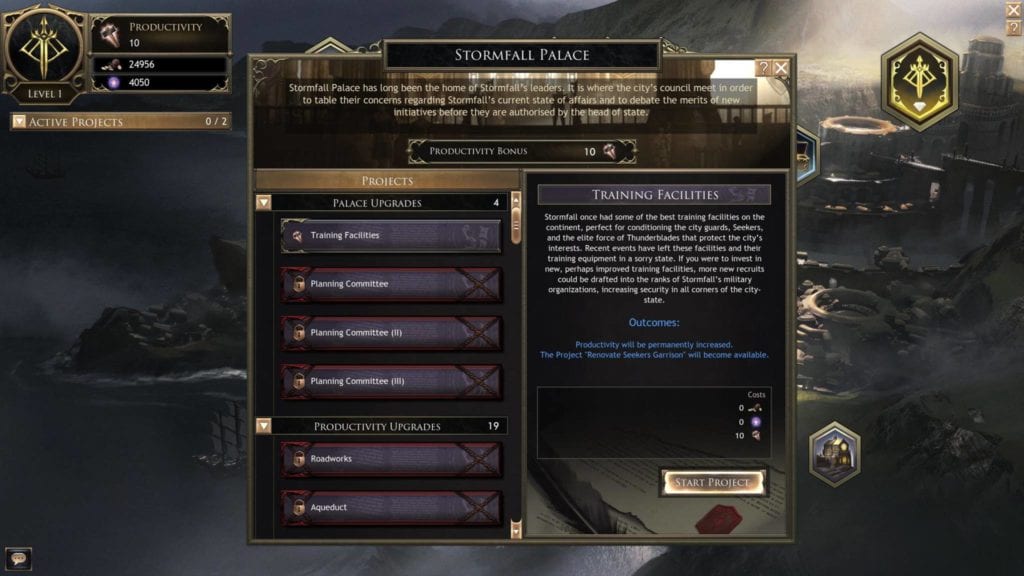 The endgame boils down to two features. First, there’s your Stormfall building management. As the new regent of the city, you’re able to start projects to improve various buildings and districts. You’ll get numerous benefits such as an additional skill slot, skill duplication, the ability to upgrade item quality or rarity, and more.