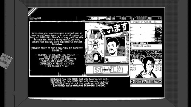 Overall, I enjoyed playing World of Horror, and still feel like there’s more to discover. Although the aesthetics and gameplay elements are fun, I was expecting to be more hands-on when solving the mystery, and for newcomers, the game can feel overwhelming. Even with the multiple endings each mystery has, I’d sometimes get annoyed having to go through the same ones and the same familiar gameplay loop. This is still a great game for fans of this horror art style, and players who like TTRPG mechanics like skill checks and turn-based combat.