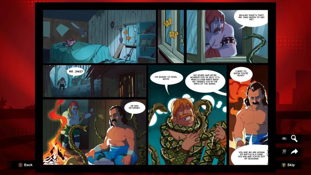 It’s actually a treat to see these ideas for the campaign’s narrative thanks to the light-hearted humor. Examples include seeing the fiery redhead Jessica Johnson intimidating Stone Cold, and the swamp-dwelling Billy Huggins fighting his mentor Jake the Snake Roberts. There’s even one bit where Paul Heyman mentions getting speared by Edge during a pay-per-view, and Stone Cold just chimes in with “Rebellion in 2002,” and a memorable panel where Brock Lesnar emerges from the swamp.