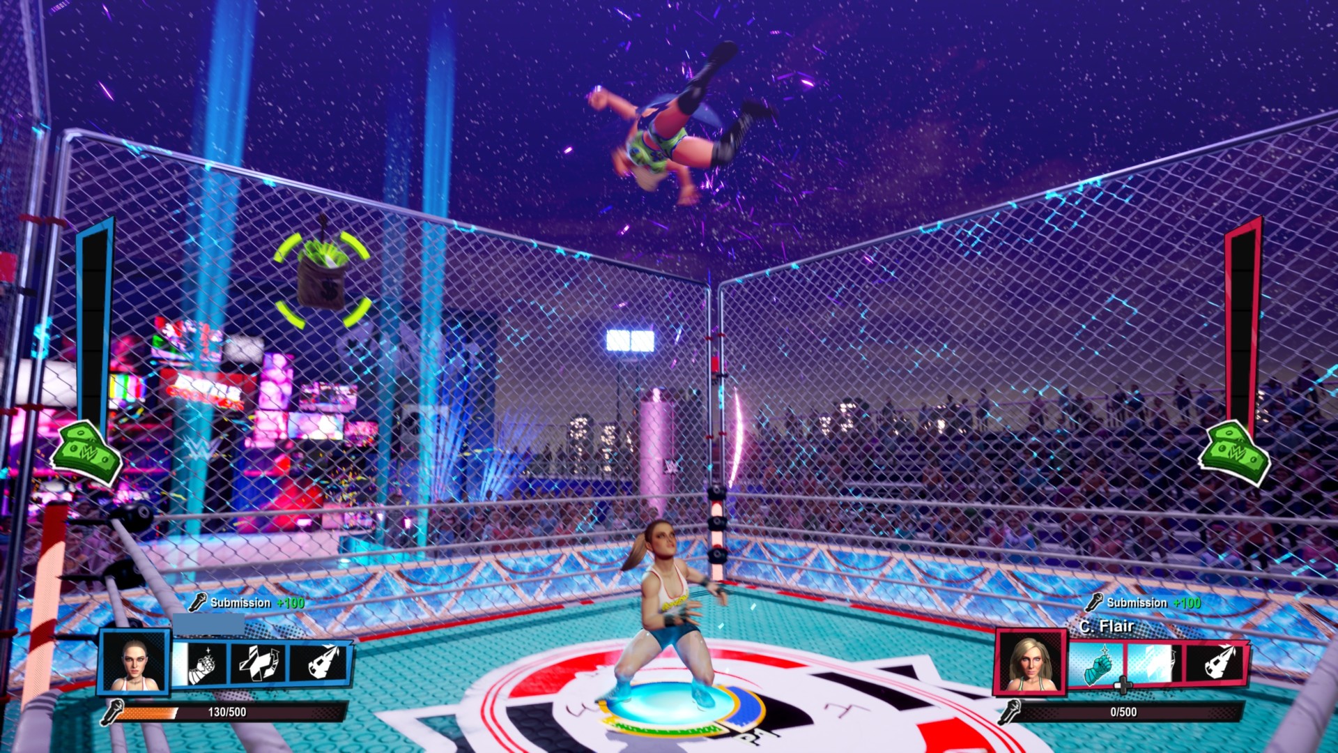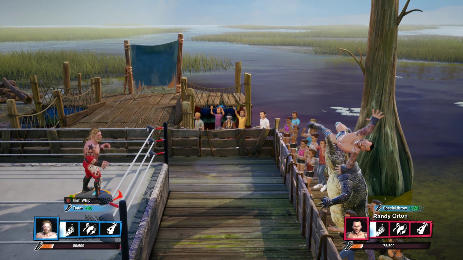 Freed from the restrictions of realism, superstars now use power-ups and crazy combos. Fists are covered in flames, lightning is cast from your fingertips, steel cages electrocute, people fly and flip through the air, and motorcycles are swung around with impunity. There are even interactive sections in various arenas that result in zany instances. You could have a goat charge an opponent, or you could throw your foe outside the ring to get crushed by a car or eaten by an alligator. I’m not kidding.