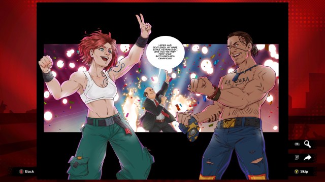 Apart from the usual game modes you’ve seen in WWE games — i.e., one-on-one, tag team/tornado tag, triple threat, fatal four-way, Royal Rumble, and the aforementioned multiplayer modes — WWE 2K Battlegrounds has its campaign. It follows the journey of seven original characters, and the story unfolds sort of like a comic book complete with panels.