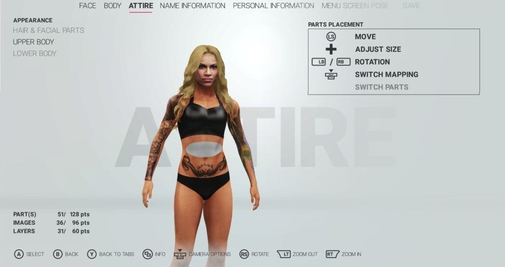 For her back tattoo, I couldn’t find a clear image, so I used several default designs to imitate it. As for her hair, my main gripe with WWE 2K19 is that, while it does have a lot of options, you can sometimes never truly find the ones that would best fit your creation. That hairstyle is the best one I could find.