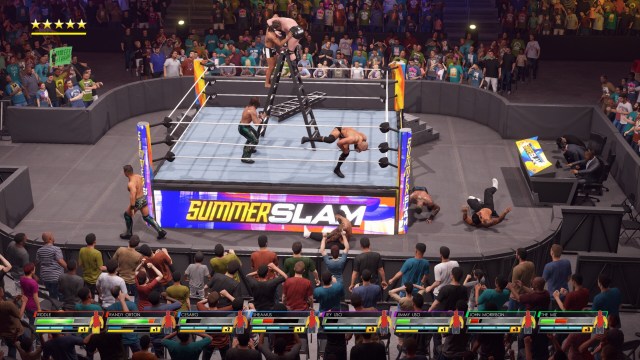 Other key changes and improvements are related to combat. This time, you’ll use a combo system, where pressing a series of buttons allows you to chain punches and kicks followed by a takedown. Animations are smoother and reversal transitions are a sight to behold. Perhaps my favorite was when I was in a battle royale and an opponent attempted to do a running attack while my back was turned. I pressed one button to do a reversal and my opponent flew over the top rope, handing me a victory. My only gripe here is the use of a grab button that requires another press to do an Irish Whip. That was a bit peculiar, though I guess it might be due to how the system is set up.