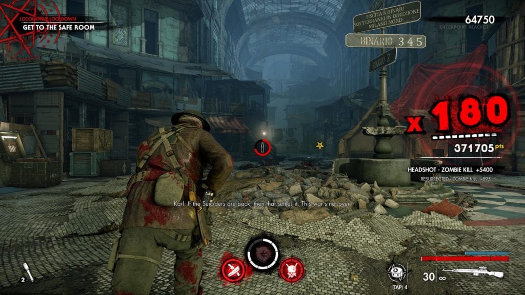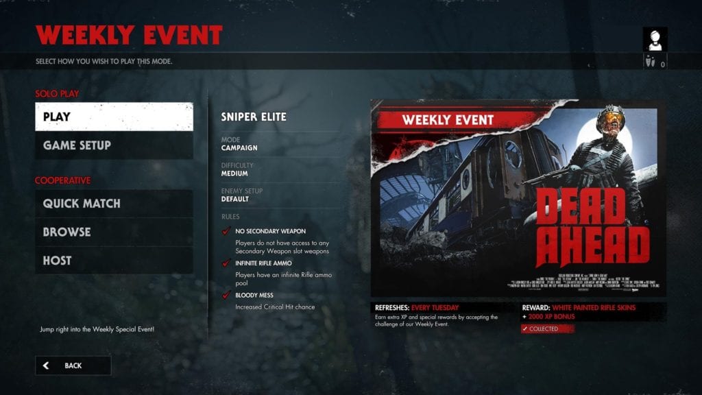 Also, take note of Zombie Army 4‘s weekly challenges. Some of these have specific restrictions and boons. The one for this week leads to the same mission. The difference is that you can’t use your secondary weapon, but you’ve got unlimited sniper rifle ammo. You’ll rack up your combo kills in no time.