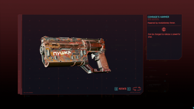 This Cyberpunk 2077 Revolver takes a little time to get accustomed to, but once you do, it’s a real weapon. Bullets can be charged to increase damage by 260%, add the chance to apply burn by 30%, Crit Damage by 50%, and reload time by 20%. The rounds are explosive.