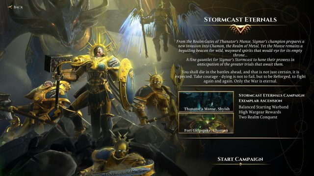 When you start the campaign, you can only play as the Stormcast Eternals (aka Sigmarines). The main character is a Lord Celestant named Freya Skyhelm. The roster has armor-clad and versatile units such as Liberators, Vanguard Hunters, and Vanguard Palladors.