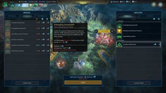 - Strategic Operations – These are usable anytime on the world map once they’re primed. Some Strategic Operations include terraforming various locations, spawning a hostile army, debuffing or destroying units in an army, killing off a city’s population, teleportation, cloaking your forces, resurrecting a hero, or starting your road to becoming the planetary governor and earning the Unifier Victory. Strategic Operations use up a Strategic Operation point and energy, and they need to be primed for several turns before being available again.