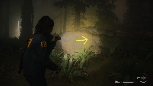 Look up to the trees around the Stash. There, with your flashlight on, you’ll spot some yellow arrows pointing in random directions. You can only see these arrows with your light, so keep it on at all times.