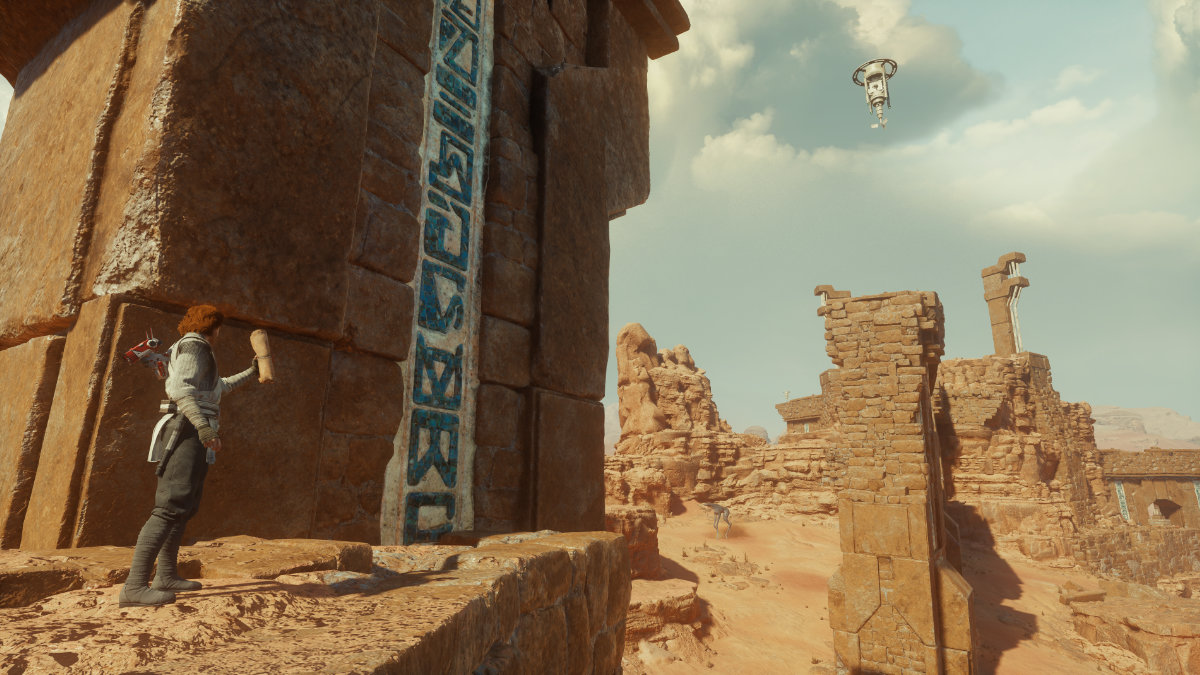 Find the first Jedha Scroll by exiting Cere’s Base into the Arid Flats and taking an immediate left right out of the door. There’s a wall you can jump up and you’ll find a Scavenger Droid hanging out just ahead. Chase it down and destroy it to get its Jedha Scroll.