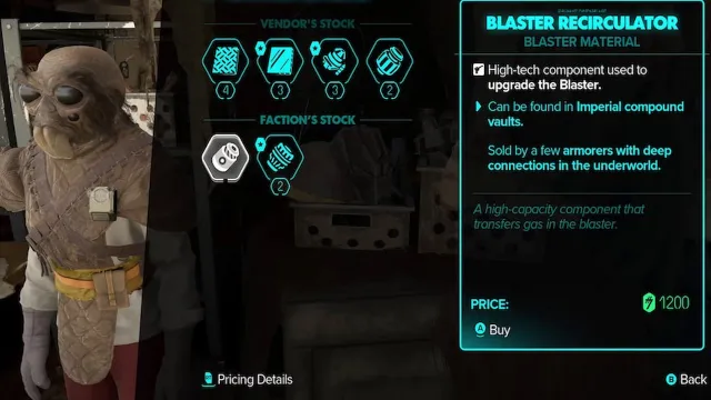 This item can be purchased from Viska the Ashiga Clan Armorer on Kijimi. This item is exclusively from the clan’s stock, so you’ll need to be in their good graces. it costs 1,300 Credits if you’re chummy with the clan, which isn’t too bad at all.