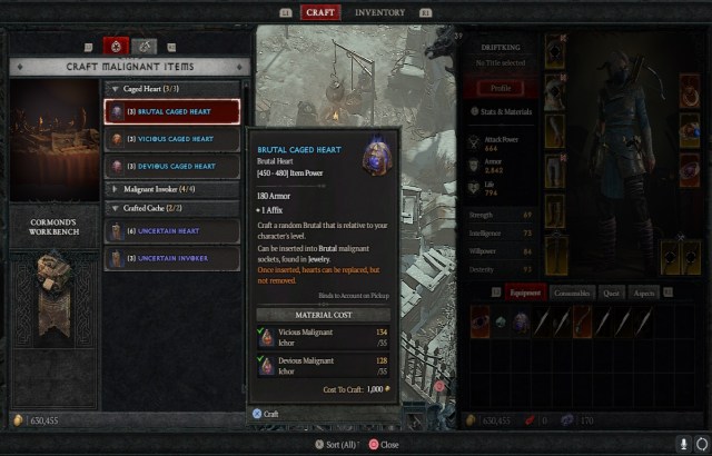 You can make Caged Hearts by salvaging your existing ones at Cormond’s Wagon. Doing this will give you ‘Ichor’ of the matching color. This Ichor is used to create Caged Hearts with the color of your choice. If you want to spin the wheel and try for a Wrathful (Black) Heart, You can craft an Uncertain Heart instead.