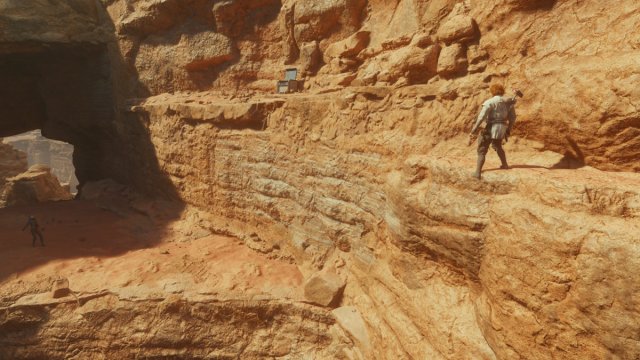 You’ll notice the first chest on a cliff ledge near Cere’s Base on Jedha on a ridge above the entrance you take when entering the base for the first time. This is near the entrance with the large stone elevator just inside for additional reference. You’ll need to travel up from the main open area on Jedha to reach the ridge where you can access the chest.
