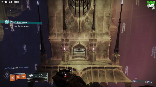 #2 In the first labyrinth room, head through the door directly to the left of the rune table. Make your way through the swinging pendulum platforms and drop to the next set of doors on your right. Now, go through the door on the bottom left. Head up the first elevator directly in front of you to find the second Arc Opaque Card in Destiny 2.