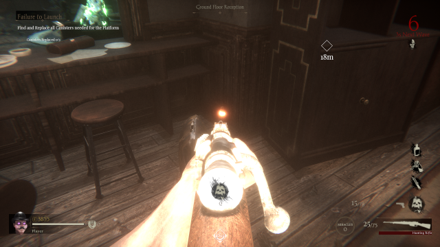 With your back to the large staircase, head to the back right of the room. Double back, and you will find yourself in a side room with all the trappings of a bar. On top of a barrel, you will find the next doll in Sker Ritual.