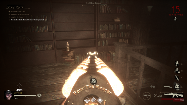 Once you have teleported to the first-floor library, head to the upper level via the stairs. At the far end of the room, you will find the next doll on top of a row of books on the floor.