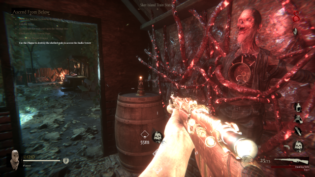 Hop out of the train and onto the train station in Sker Ritual. Here, you will see a small cabin to your right. Inside is a man glued to the wall by the red vines. To his left, you will see a barrel with the next Sewer of The Dead doll in Sker Ritual.