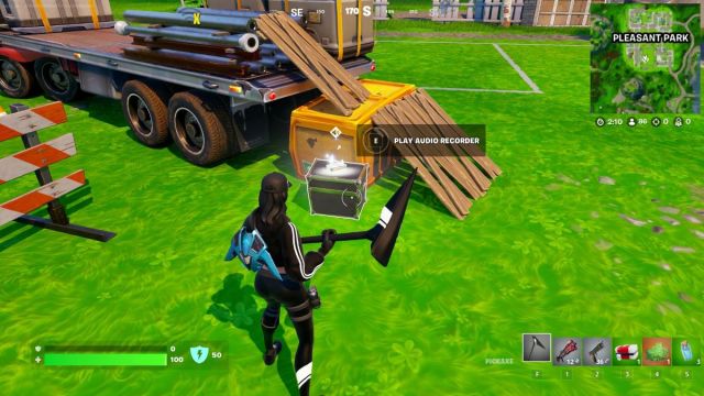 It’s available to grab in plain sight at Pleasant Park. It’s not often you see Pleasant Park with a huge number of players this season, so you should be good to go. When you reach the soccer field in the southern part of Pleasant Park, you’ll see many crates and construction materials occupying the back of a parked truck. Check out the rear left wheels of the truck, and you’ll see a recorder next to them waiting for you.