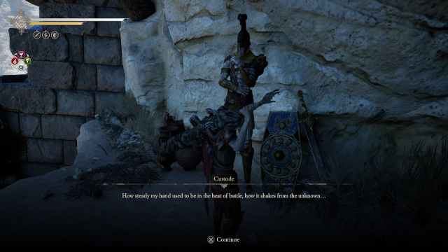 The second location players can find Custode is near the Hall of the Great Statue fast travel checkpoint. Take a left from the checkpoint and instead of going down into the main area, take another left to find him hanging by a cliff. Speak to him again and exhaust his dialogue.