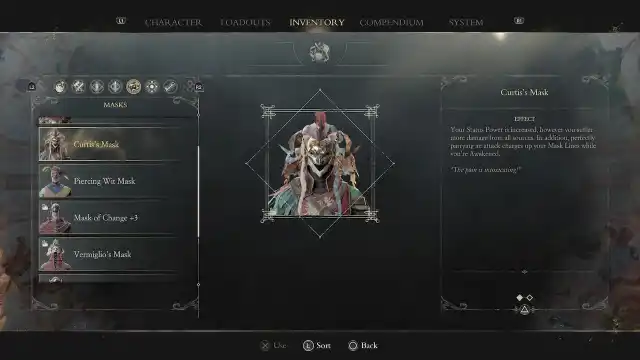 Effect: Your Status Power is increased, however you suffer more damage from all sources. In addition, perfectly parrying an attack charges up your Mask Lines while you’re Awakened.