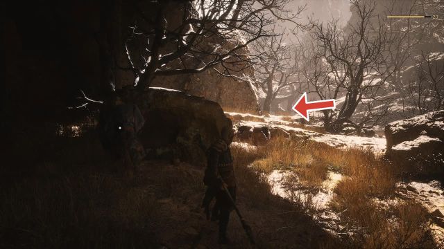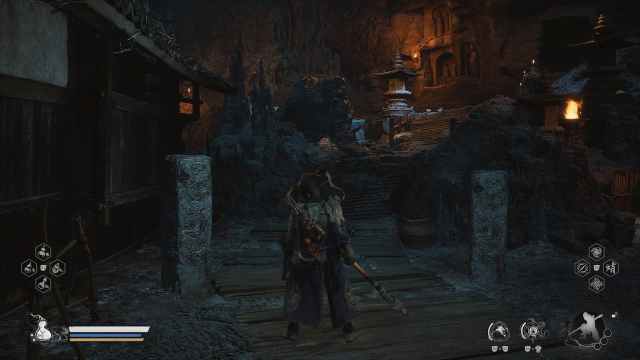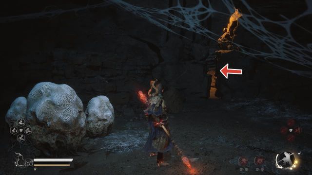 After defeating the Buddha’s Right Hand boss at the Cliff of Oblivion, proceed to the lower areas of the cave until you reach the Lower Hollow Keeper Shrine. From the shrine, go through the hanging cobwebs and hug the wall to the left until you find a crack in the wall.