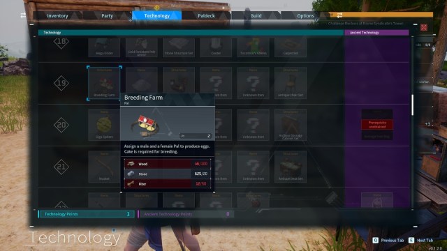 To breed Pals, you’ll need a Breeding Farm. You’ll unlock this at level 19 Technology. Unfortunately, you can’t just have them breed without some incentive. You’ll need to feed them Cake, which you can get in a few different ways, explained further below.