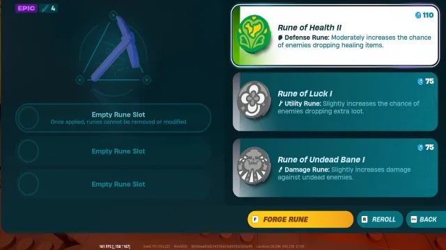 Upon selecting an item, you will be given a choice of three random runes from the ones you’ve unlocked. But don’t worry, you can reroll them. It costs essence to equip a rune, with more powerful renditions of a rune costing more essence. Thankfully, you can gain essence from doing virtually anything in LEGO Fortnite.