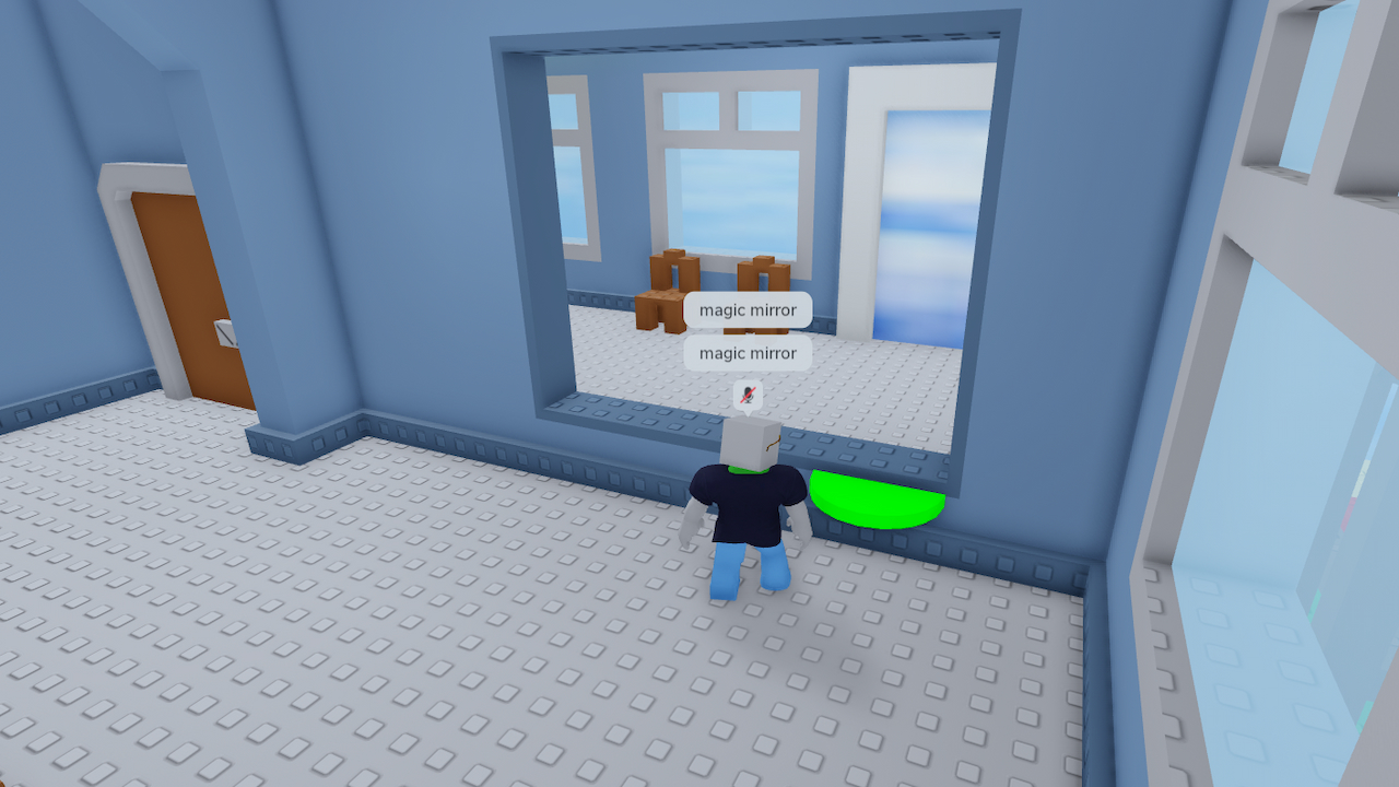 Walk up to the Cafe (left of the Happy House), and walk into the building. Type and send “magic mirror” in chat, and the mirror will turn translucent, allowing you to walk through it.