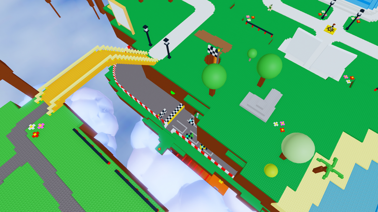 Find the checkered flag on the main island (left of the Happy House stairs) and drop down. Take a left and you’ll see a series of white panels with Roblox characters on them. You are required to state the names of these characters to progress through.