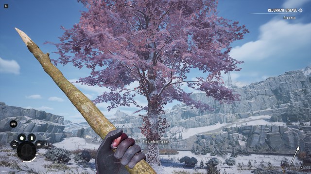 Walk over to the pink tree. The map shows that the stash is inside a cave on the lowest ridge that supports the tree. Slowly, descend the side of the rocky walls. At the bottom will be a cave blocked by a cage and guarded by a wolf. You’ll have to take the wolf out and drag the cage aside.