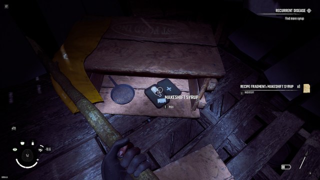 Grab the shovel and start digging. You will unearth a crate, with a Syrup inside. You can consume it now – the effects stack. Take all items and notes. One of the notes will be a fragment for a Makeshift Syrup recipe, and another will be a clue to the next Syrup.