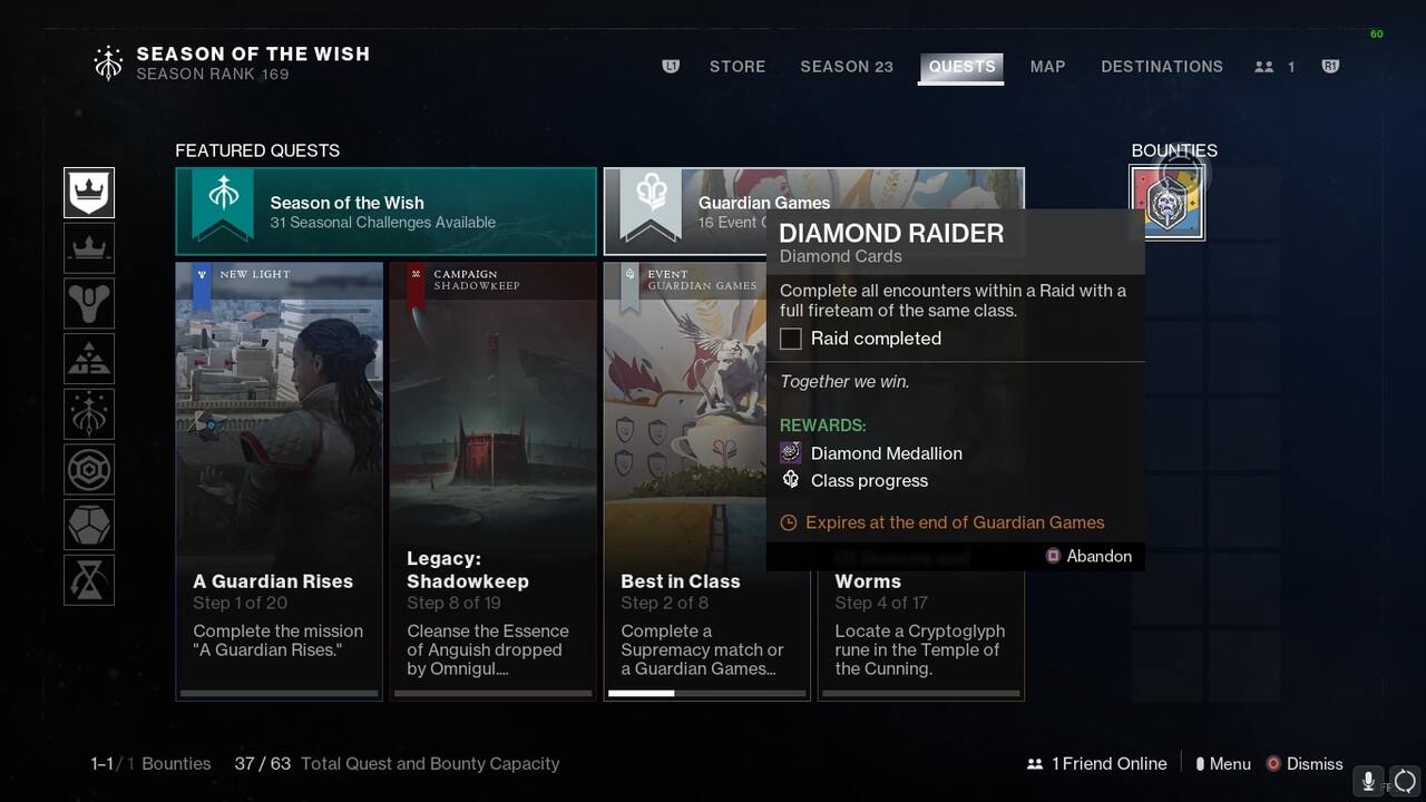 There are always two Diamond Contender Cards available each week. During Week 1, the Twitch Drop Diamond Medallion is available as well as the Diamond Raider Contender Card which is the PvE option. To complete Diamond Raider, you have to beat all the encounters of a Raid with a full fireteam of the same class. That’s a really high order, one that can only be done with LFG, but it’s worth it for the Diamond Medallion.