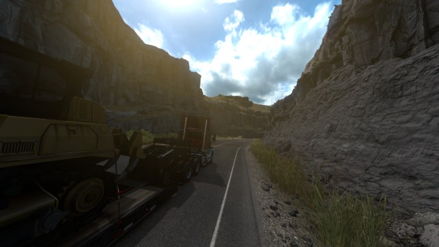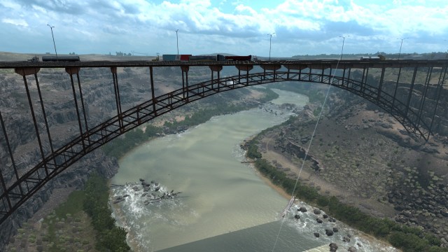 My American Truck Simulator – Idaho journey started in the central east, with one of the Washington border towns, Ontario. From there, I moved into Idaho and headed towards Twin Falls as the first stop. As I gazed around the new state, to be honest with you, I wasn’t really all that impressed. While I thought it was generally okay, nothing really caught my eyes at first. That was, until, I crossed the Perrine Memorial Bridge, which is just outside of Twin Falls along US Highway 93. My jaw literally dropped as I made my way towards the center of the bridge, which hangs stunningly over the massive Snake River that’s being fed by gorgeous, roaring waterfalls. Very handily enough, on the side of the road was a turn off lane that had a new Scenic Viewpoint hovering above it. It looks like American Truck Simulator’s scenery designers were so confident in their work that they added this new feature just for the sake of flexing. But, by all means, they deserve it.