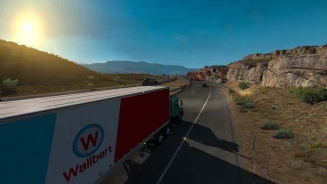 As I pushed further east, I noticed a drastic change in the scenery. All of the lush greenery that I had already grown very fond of just went ahead and vanished! No, it wasn’t a glitch; it just turns out Washington’s tagline of being the “Evergreen State” is only mostly true. From my observations, it appears the southeastern part of the state consists mostly of dry, rocky areas. This terrain is, of course, what makes up most of the other states on the map to the extreme south. So, I was surprised to see that terrain stretch this far up. As someone that’s never been to Washington, I don’t know if it’s because the season in ATS mostly replicates summer rather than spring, or if these areas really are dry mostly year-round.