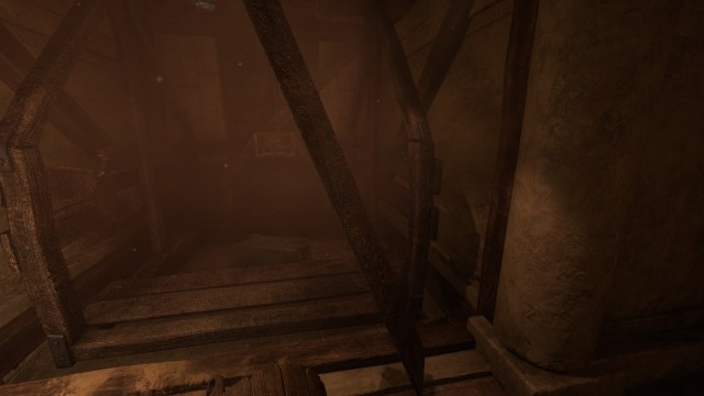 Next, you’ll spot a wooden plank leaning on the wall off to the side of the elevator. Lift and place it so that you’re able to stand on it as you’re rotating the wheel.