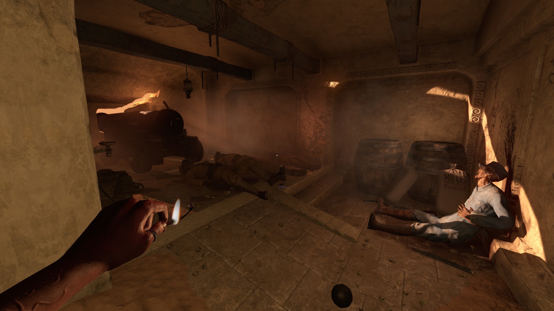 The room at the end of the hallway has several corpses and a couple of cannons.
