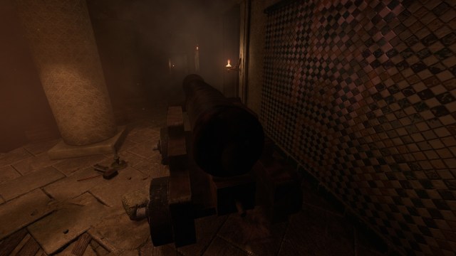 The central room is locked, so you’ll have to loop around. While doing this, you’ll spot a cannon in the middle of the hallway as well as a well-lit room.