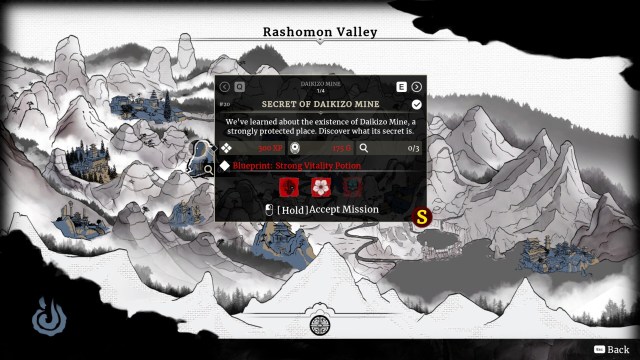 The mission in question is called The Secret of Daikizo Mine. This is a quick mission focused on a couple of cutscenes, so you can beat it in about a minute and a half if you’re quick. After your initial run of this level, you’ll get 300 XP for beating it, plus another 150 XP for getting an S-rank. Now, if you do things right, you shouldn’t need to bring anything or even interact with a single enemy while doing this. If you get seen while practicing, even that shouldn’t bring you down to an A-rank, so don’t worry.