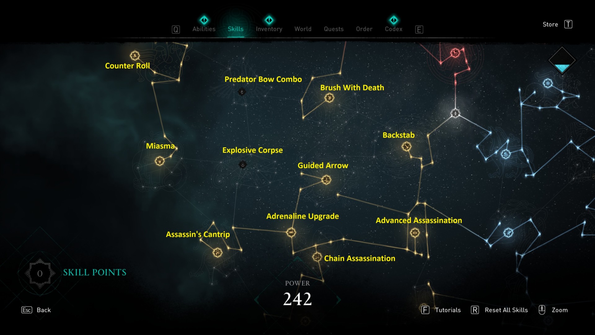 Below, you’ll see images of the Raven-type (yellow) skills in Assassin’s Creed Valhalla. Take note of the nodes that connect to new sections of the skill tree as well.